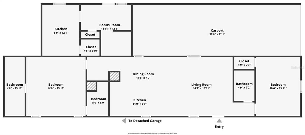 Tucked in the established Country Green area, this move-in ready 2005 manufactured home sits on a quarter-acre (approx. 85’ x 132’) lot and features a covered carport 39'8" x 12'1" plus a detached garage—perfect for extra storage, hobbies, or a workshop. Inside you’ll find easy single-level living with tile floors throughout, an open living/dining area, and a kitchen with good prep space. The split layout includes a spacious primary bedroom (14'0" x 13'11") with an en-suite bath, a generous second bedroom (10'6" x 13'11"), and a third room (5'0" x 8'0") ideal for a nursery or home office. A flexible bonus room (11'11" x 12'1") off the carport adds great utility for a gym, studio, or playroom. Outside, enjoy the fully fenced yard, shade trees, and covered porches—perfect for pets, play, and weekend projects. Fantastic location close to restaurants, supermarkets, Downtown Kissimmee, and Kissimmee Gateway Airport with quick access to US-192, John Young Pkwy, and the Turnpike. Public records indicate 3 beds/2 baths and 924 sf; buyer to verify all measurements, room count, and uses shown on the floor plan. Flood Zone X per FEMA (generally outside special flood-hazard areas). Come see it today! all measurements are approximate.