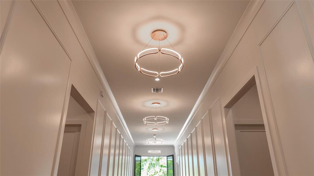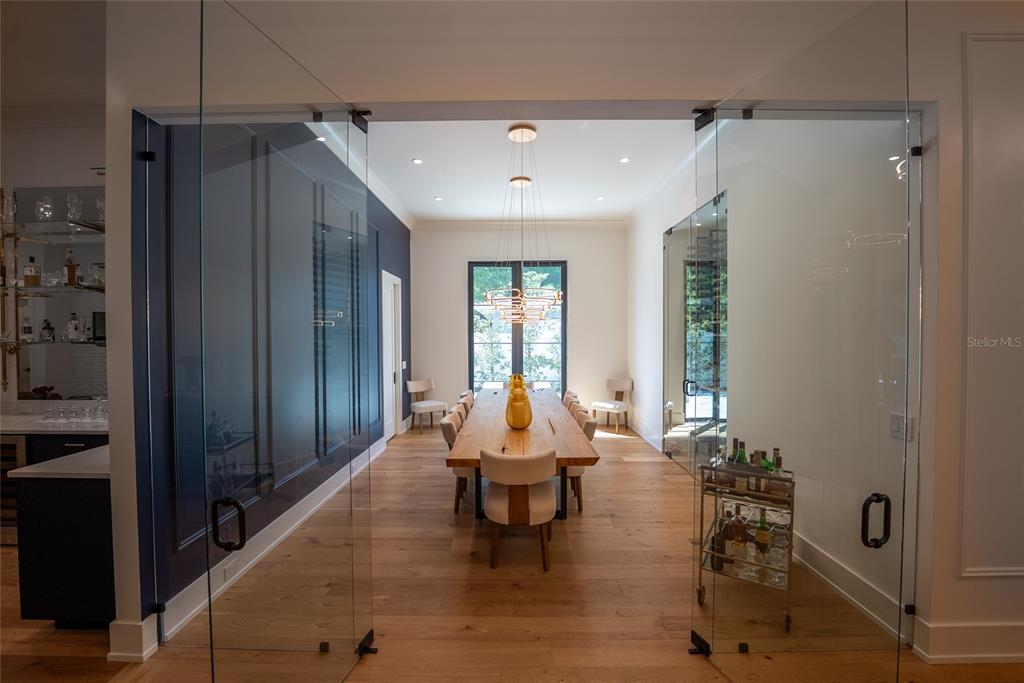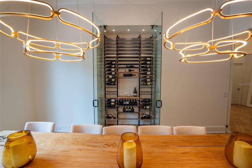Adorned with 5 LED Chandiliers, the Gallery is a centerpiece of the home. The Formal Dining room sits off the Gallery, encased in glass, and the room can hold 12 dinner guests. The Formal Dining room includes a 200-bottle glass-enclosed wine wall. Through the Formal Dining room, you will find 10â glass doors leading to the dining lanai featuring the custom-built stone firepit. The Brass and Glass Bar stands at the end of the Gallery. The centerpiece of your entertaining.