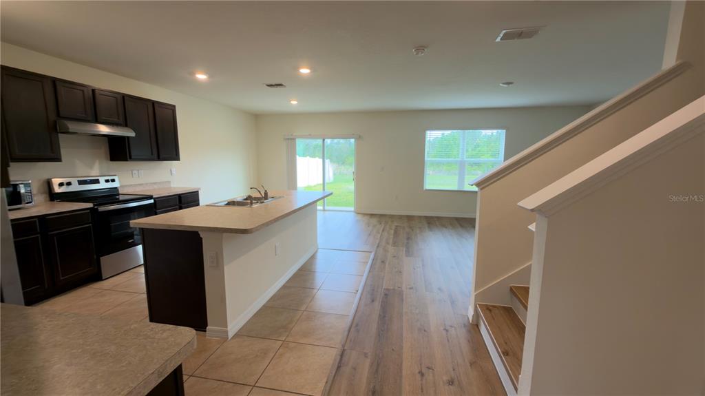The spacious living area flows seamlessly into the kitchen, complete with a large center island and a walk-in pantry, ideal for both everyday living and entertaining.
