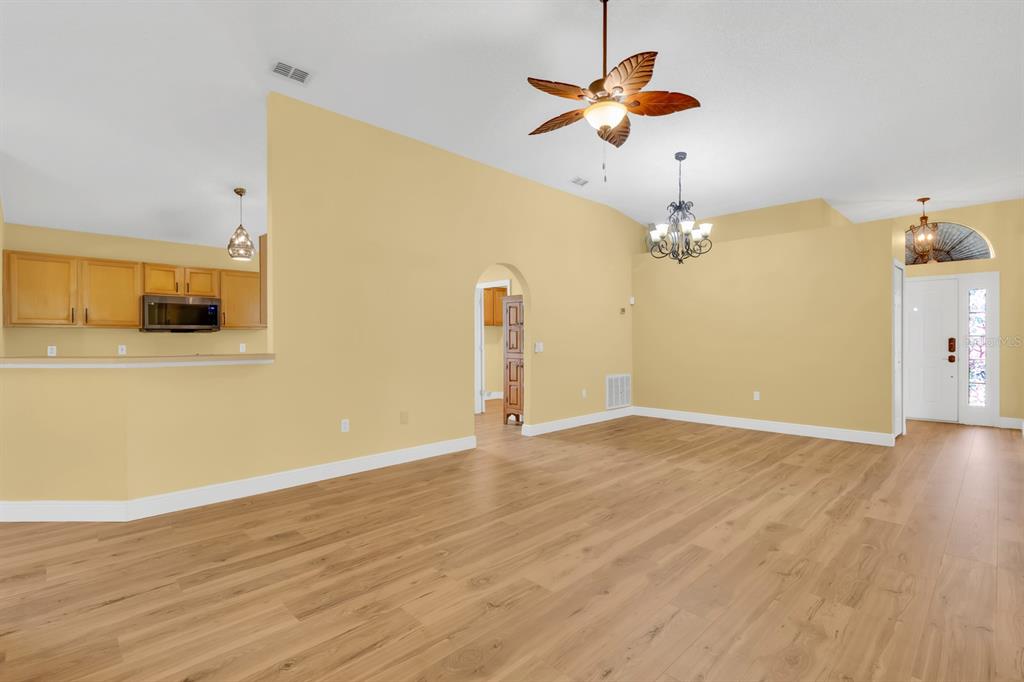 Inside, an open and spacious floor plan is filled with abundant natural light and enhanced by vaulted ceilings, architectural arches, and plant shelves that add character throughout. High-end waterproof laminate flooring with a 25-year warranty flows through the main living areas, complemented by new carpet in all bedrooms and tiled bathrooms with brand-new toilets. The kitchen features stainless steel appliances less than five years old, selected for quality and durability, and offers ample space for a cozy eat-in area while remaining open to the main living spaces, perfect for both everyday living and entertaining.French doors lead to the oversized screened-in, tiled porch, finished with beautiful Spanish tile that matches the upgraded paver entry walkway at the front of the home. This exceptional outdoor living space easily accommodates dining and lounging furniture, or even a ping-pong table, and includes two ceiling fans to keep you comfortable during the warmer months. With an outdoor area like this, itâs easy to imagine spending most of your time right here.