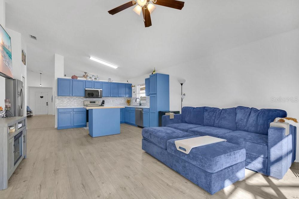 • Interior Features: Ceiling Fan(s), High Ceilings, Kitchen/Family Room Combo, Living Room/Dining Room Combo, Primary Bedroom Main Floor, Solid Wood Cabinets, Split Bedroom, Thermostat, Vaulted Ceiling(s), Walk-In Closet(s)