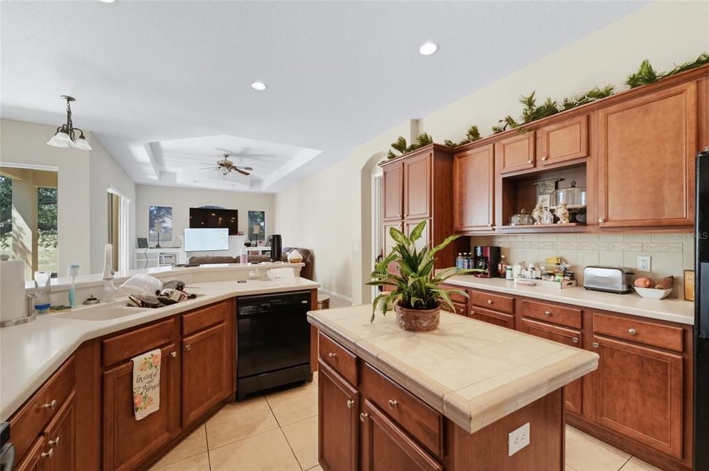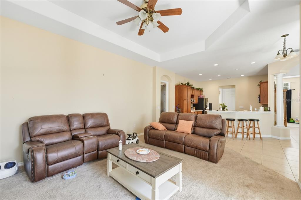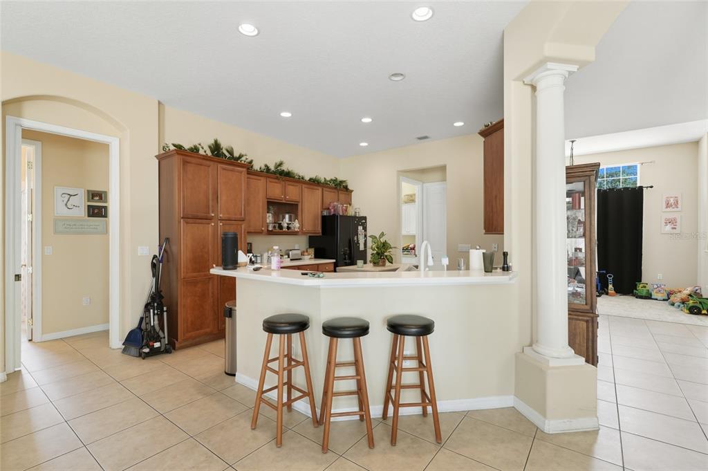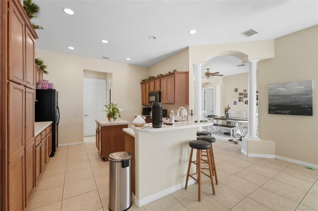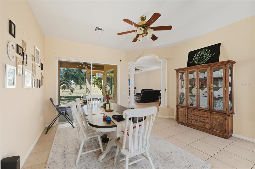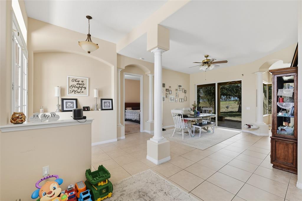 Exceptional Opportunity! Welcome to 33213 Irongate Dr, Leesburg, FL 34788 a stunning 2,163 SqFt, 3-bedroom, 2-bath home featuring a smart and functional layout with separate living and dining rooms, a cozy family room with custom built-in shelves, and a bright breakfast nook that opens to a spacious patio perfect for entertaining or relaxing. With 10-foot ceilings, elegant columns, rounded corners, and decorative plant shelves, the home feels open, stylish, and welcoming. Ceramic tile flooring flows throughout the main living areas, while the family room and bedrooms provide comfort and warmth.
