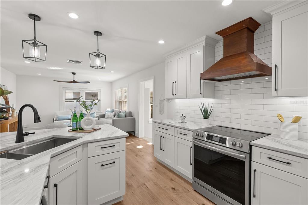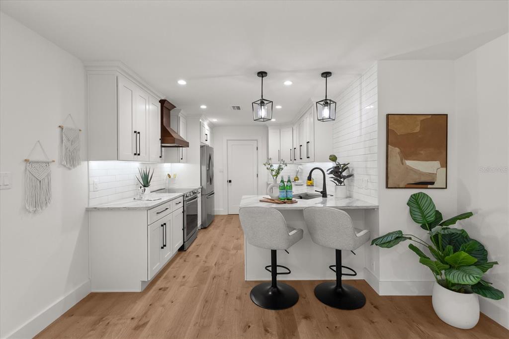 The heart of this home is undoubtedly the stunning kitchen, featuring all-new stainless-steel appliances, new shaker cabinets and a beautiful wood range hood, as well as exquisite quartz countertops. The chef’s work sink adds functionality, while the eat-in peninsula provides a casual space for quick meals or lively conversations with friends. The harmonious blend of modern finishes and thoughtful design makes this kitchen a true delight for any home chef.