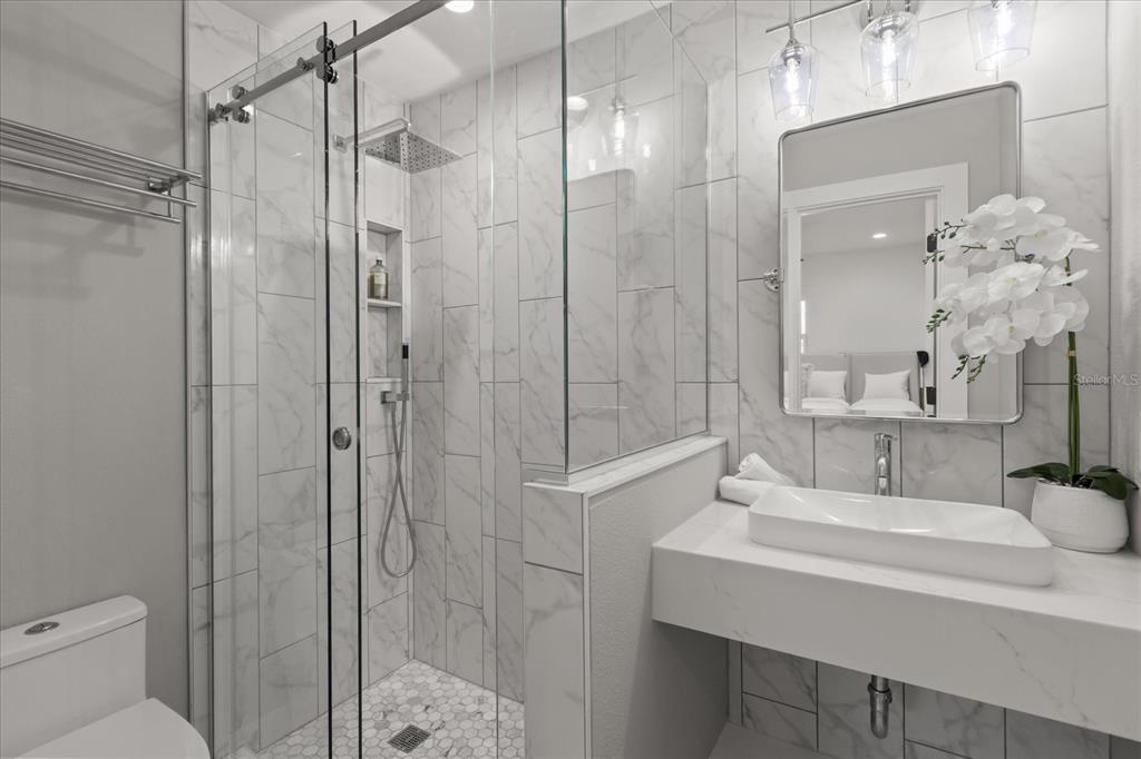 As you explore further, you’ll find two spacious bedrooms, each designed for comfort and tranquility. The primary suite boasts a luxurious new bathroom adorned with marble tile and a glass-enclosed shower, offering a spa-like retreat to unwind after a long day. The guest bathroom, with its charming vintage tiles and 1950s cottage design, adds a delightful touch of character.