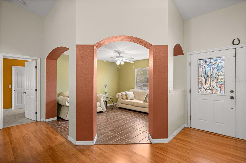 Inside, the home offers a spacious and unique layout with soaring ceilings, warm flooring, and beautiful architectural details throughout. The grand main living area is enhanced by built-in columns and opens into two additional flex spacesâideal for a formal dining room, sitting room, office, or play area. The kitchen is perfectly positioned with a breakfast bar and a second dining area nearby for casual meals and entertaining.