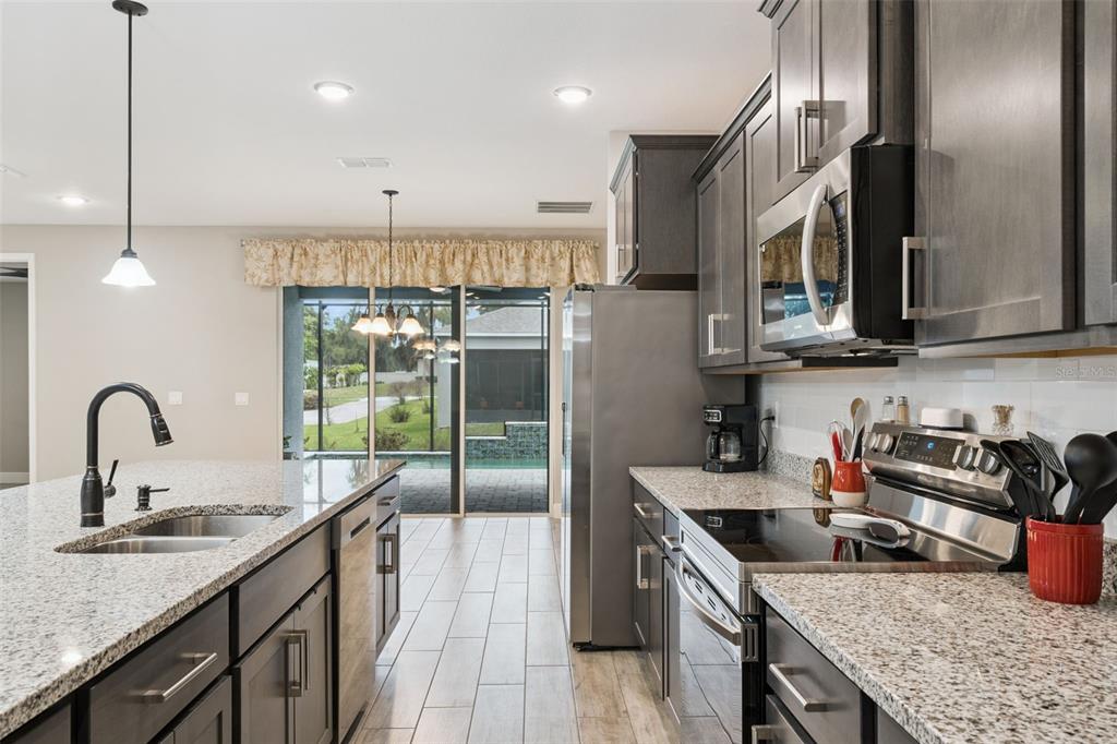 One or more photo(s) has been virtually staged. This well-maintained home is situated in the highly sought-after gated community of Majestic Oaks in Leesburg. The property features an open floor plan connecting the living room, dining area, and kitchen, providing functional living and entertaining space. The primary bedroom includes a large walk-in closet and an en suite bathroom with a walk-in shower featuring multiple shower heads and a separate tub. A secondary en suite bedroom also offers a walk-in closet and walk-in shower, suitable for guests or multi-generational living. The kitchen includes a walk-in pantry, ample cabinetry, and a countertop with seating. Additional interior space includes an office/den, offering flexibility for work or other uses. This property features a sparkling heated pool enclosed within a screened birdcage, creating the perfect private outdoor retreat, complemented by beautifully sealed paver surfaces. Screened front porch, solar tube in the laundry room. The home is equipped with whole-house window tinting for enhanced energy efficiency and privacy, along with ceiling fans in every bedroom. Additional upgrades include an epoxy-coated garage floor, comfort-height toilets throughout, a full gutter system, and a hot water recirculation system for near-instant hot water. A detached shed provides convenient extra storage space. This home blends practical upgrades with everyday luxury, ready for you to move in and enjoy. The property also includes deeded lake access with a community dock located across the street.