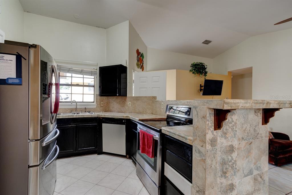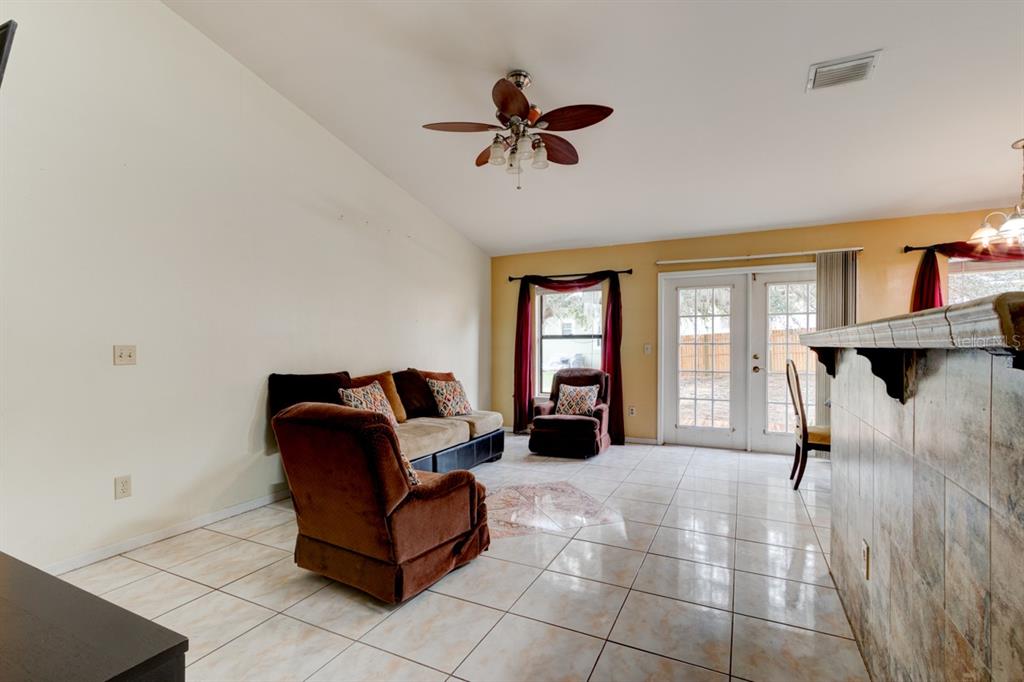 Step inside to discover porcelain tile flooring throughout—no carpet—creating a sleek, low-maintenance interior. The spacious living room features vaulted ceilings and opens through French doors to a generous backyard, ideal for relaxing, entertaining, and soaking up the Florida sunshine.