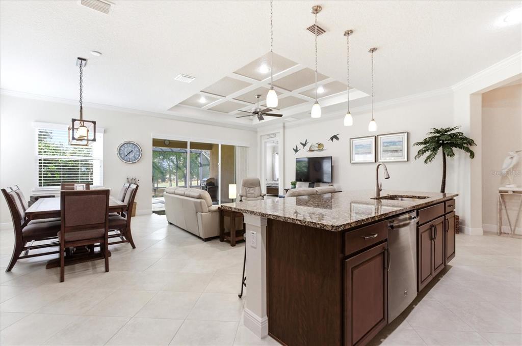 Welcome to a beautifully updated 2-bedroom plus den with Murphy Bed and office built-ins, 2 baths, and a 2-car garage home, situated on a premium golf course lot. Located in Victoria Park, DeLand, is the area's most sought-after planned community. This move-in-ready home offers natural beauty, comfort, and convenience. From the moment you pull into the paver driveway, you will admire the charm of this Craftsman-style home. The spacious covered front porch is just waiting for a couple of patio chairs to enjoy the peaceful views. Step inside through the elegant glass front door, and you will be impressed by the spacious open concept layout featuring a light and bright great room and separate kitchen and dining areas, the heart and functional center of the home. Neutral 18" ceramic tile on the diagonal, custom blinds, and recessed lighting can be found throughout, with new plush carpet in the bedrooms. The heart of the home is the beautifully updated kitchen with granite counters, a center island large enough for four barstools, solid wood custom cabinetry, gas range, and walk-in pantry, perfect for everyday living and entertaining. The ceilings have crown moldings throughout, with a custom-designed tray ceiling in the great room. The primary suite is a true retreat, offering tray ceilings with a ceiling fan, an updated en-suite bathroom with his and hers vanities, an elegant ceramic tile shower, and a large walk-in closet with ample storage. Wake up and enjoy the tranquil ambiance of this exceptional home. The den has a built-in office with ample file storage, a printer cabinet, a queen Murphy bed, and his and her wardrobes. Relax on the expanded screened lanai with a "picture window" view of the 17th fairway on the award-winning regulation Victoria Hills Golf Course. The indoor laundry room includes a washer, dryer, and utility sink. The 2-car garage features built-in overhead steel storage racks and a pull-down attic stairway. Offering natural beauty, comfort, and convenience, this move-in ready home is perfect for those seeking low-maintenance, elegant living with access to nearby amenities and a welcoming neighborhood atmosphere. Priced to sell! Schedule your showing today.